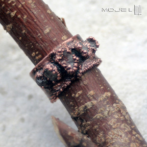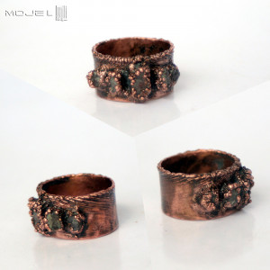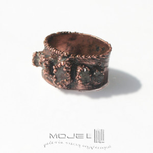 Pierścionek / obrączka z kamyczkami surowego szafiru. Struktura powierzchni powstała z miedzi w technice elektroformowania, stąd nieregularna faktura. Miedź jest delikatnie patynowana i przecierana dla wydobycia faktury.