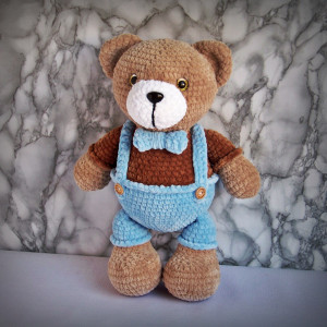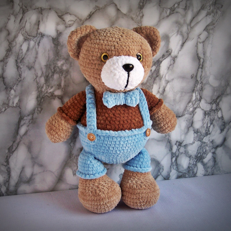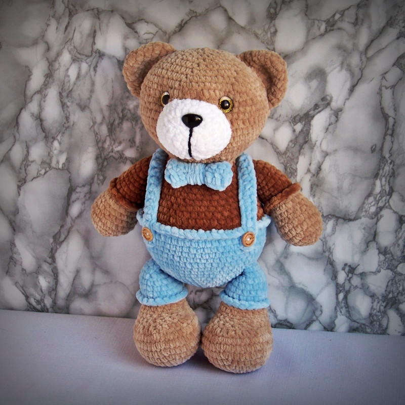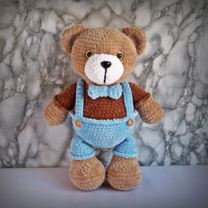 Szydełkowy miś 36cm w niebieskich spodenkach
