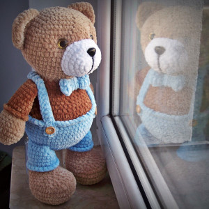 Miś jest zrobiony z bardzo delikatnej i miłej w dotyku włóczki, jest to certyfikowana włóczka antyalergiczna. Nosek i oczka są trwale zaklipsowane, nie da się ich wyrwać. Miś może być misiem do przytulania, ale także może być misiem dekoracyjnym, który doda ciepła i uroku każdemu wnętrzu. Wysokość misia to ok. 37 cm (na stojąco).