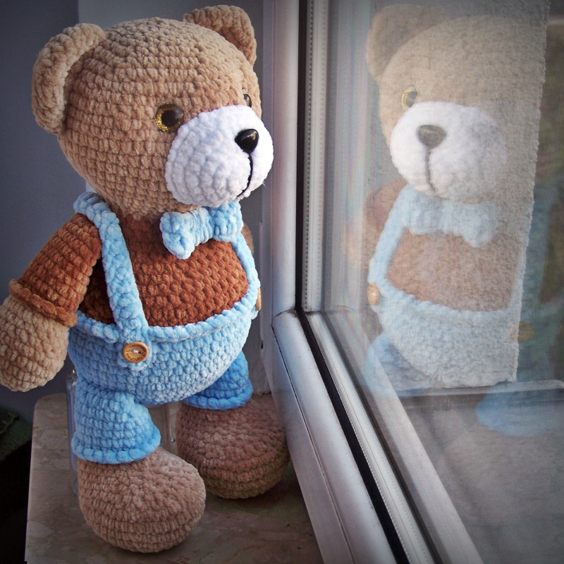 Szydełkowy miś z delikatnej włóczki w niebieskich spodenkach
