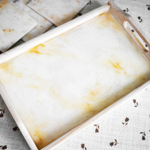 Piękna, drewniana taca z abstrakcyjnym motywem. Niepowtarzalny wzór łączy w sobie różne efekty- spękania, fale w kolorze bieli i złota, złocony brokat. Boki tacy pobielone i zabezpieczone lakierem do drewna.