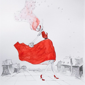 Praca "Taki lekki stan bycia" wykonana akwarelami i piórkiem przez artystkę plastyka Adrianę Laube na białym 300g papierze A3. Praca sygnowana, wysyłana w kartonowej tubie.