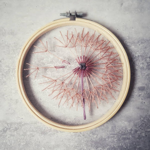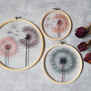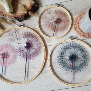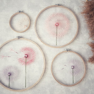 Ręcznie haftowane obrazki przedstawiające dmuchawce w kolorystyce różu, fioletu i beżu wykonane na tiulu. Ramki wyglądają na ścianie niezwykle delikatnie dzięki przezroczystości tiulu. Pozostawione zostały w tamborkach, które mogą służyć jako ramka.