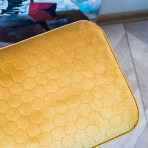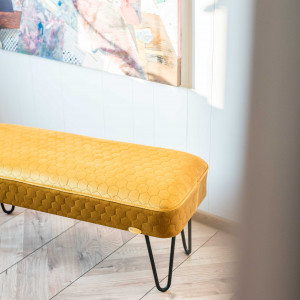Ławeczka tapicerowana w stylu loft. Produkt w 100% wykonany ręcznie w naszej pracowni. Tkanina typu welur pikowana w heksagony w pięknym miodowo- złotym kolorze. Możliwość zastosowania innej tkaniny. Nogi metalowe typu hairpin legs w kolorze czarnym (nogi mogą być pomalowane na inny kolor).