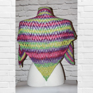 Efektowna kolorowa ażurowa chusta. Została wykonana z miękkiej akrylowej wełny. Jest bardzo przyjemna w dotyku, lejąca, włókno połyskiem przypomina jedwab. Polecam ją na wiosnę i jesień. Przyda się również na plaży jako piękny dodatek do bikini.