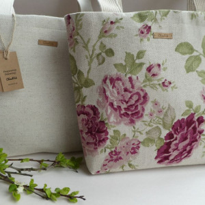 Torba typu shopper wykonana z lnu obiciowego w kolorze jasnobeżowym z motywem róż.