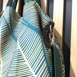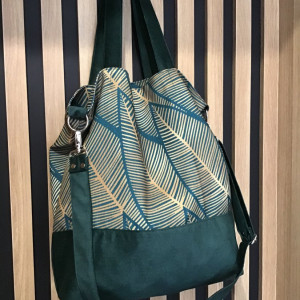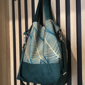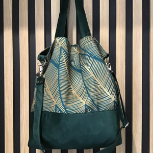 Pojemna torba z printem w graficzne liście, wykonana z płóciennej, wodoodpornej tkaniny w połączeniu z welurem.