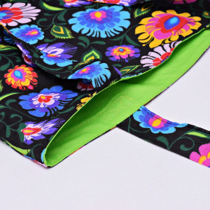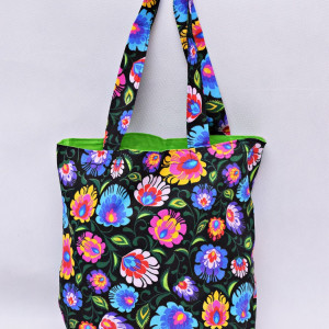 Ekologiczna torba na zakupy uszyta z bawełny 100% z motywem łowickim i bawełnianą zieloną podszewką.