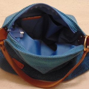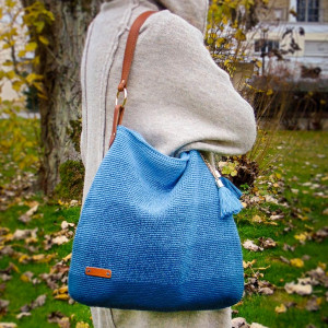 Torba wykonana na szydełku z wysokiej jakości włóczki o składzie 50% bawełny i 50% akrylu. Efekt ombre: od dołu petrol (ciemny przybrudzony niebieski) przechodzi ku górze w jasny petrol (jaśniejszy brudnoniebieski).