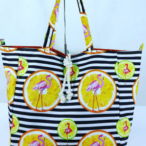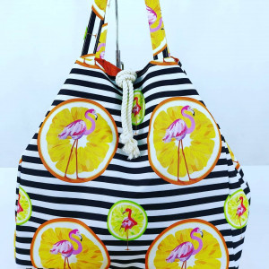 Torba plażowa z rączkami na ramię.Uszyta z tkaniny wodoodpornej w piękny wzór flamingów na biało-czarnych pasach.