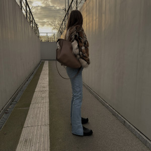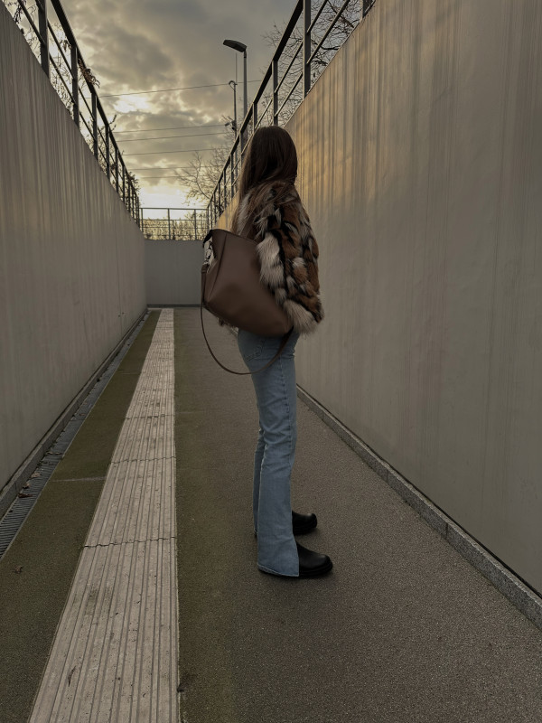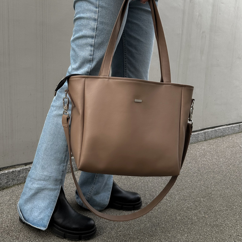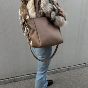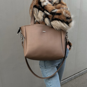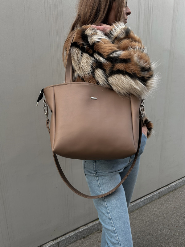 Torba z jasno brązowej eko skóry z głębokim dnem, mieszcząca format A4. Posiada długi odpinany pasek.