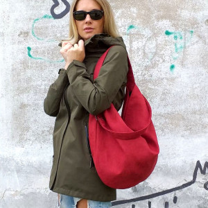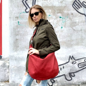 Workowata torba w kolorze cegły z ekologicznego zamszu na ramię lub na skos.