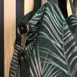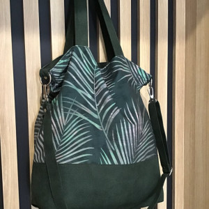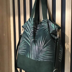 Pojemna torba z ozdobnym printem, wykonana z welurowej tkaniny w połączeniu z alcantrą.