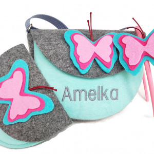 Torebeczka miętowa imieniem, portfelik, opaską róż motyle