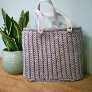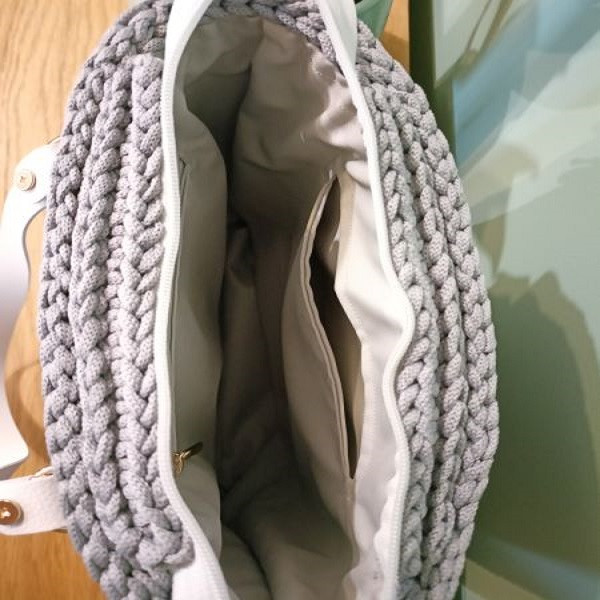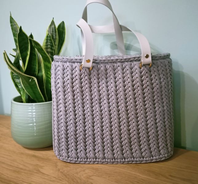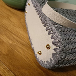 Torebka jest wkonana z sznurka poliestrowego wysokiej jakości, odpornego na wilgoć, mechacenie się oraz promienie słoneczne, a także z dodatkami z skóry naturalnej.