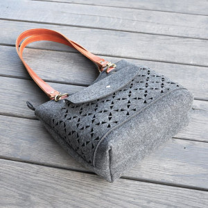 Piękna, kobieca i elegancka torba do noszenia na ramieniu. Zaprojektowana i uszyta z grafitowego, grubego i sztywnego filcu jednostronnie impregnowanego 100% poliestrowego.Torebka ta nie będzie się szybko mechacić ponieważ jest uszyta stroną impregnowaną na zewnątrz. Front torebki ozdobiony dużą kieszenią z geometrycznym wzorem powtarzających się trójkątów. Rączki torebki są uszyte z naturalnej skóry bydlęcej. Z czasem będą się przecierać. Są zamocowane na karabińczyki do torebki. Wewnątrz duża przegroda. Dodatkiem do torebki jest mniejszy organizer zamykany na nap. Można do niego schować dokumenty, telefon. Może on zmienić wygląd torebki z przodu kiedy włożymy go i przypniemy do kieszonki z przodu torby. Torebka zamykana na suwak ozdobiony skórką. Całość jest sztywna i wygodna.