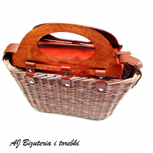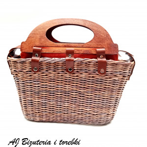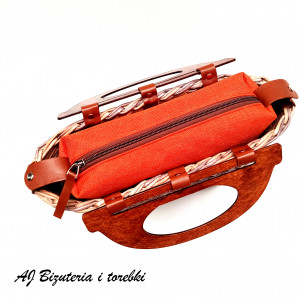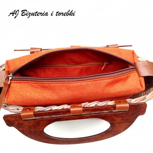 Wygodna torebka typu koszyk, wykonana z papierowej wikliny w kolorze brązowym połączonej ze skórą w kolorze ciepłego brązu. Wnętrze to torba z wodoodpornej tkaniny w kolorze pomarańczowym, wewnątrz die kieszenie (otwarta i zamknięta). Całość zabezpieczona lakierem akrylowym.