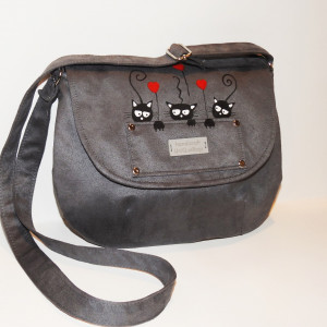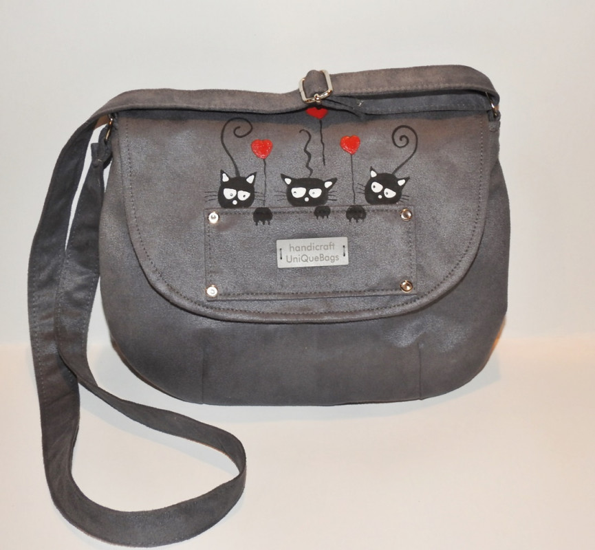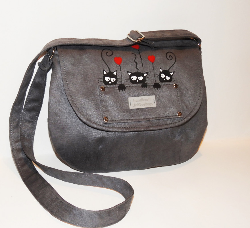 Torebka wykonana jest z zamszu tapicerskiego- tkaniny o rewelacyjnych parametrach użytkowych- odpornej na ścieranie, plamienie, trwałej i miłej w dotyku.Ozdobiona jest rędznie malowanymi kotkami (niepękające, niezmywalne farby do tkanin)