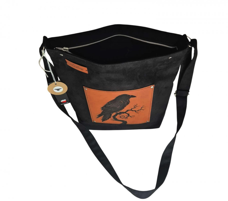 Front torby ozdobiony jest laserowo ciętą i grawerowaną laserowo grafiką z krukiem, na skórze ekologicznej leatherlaser.