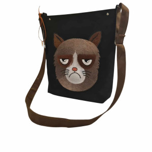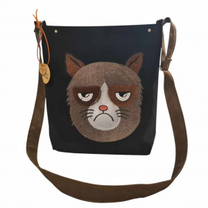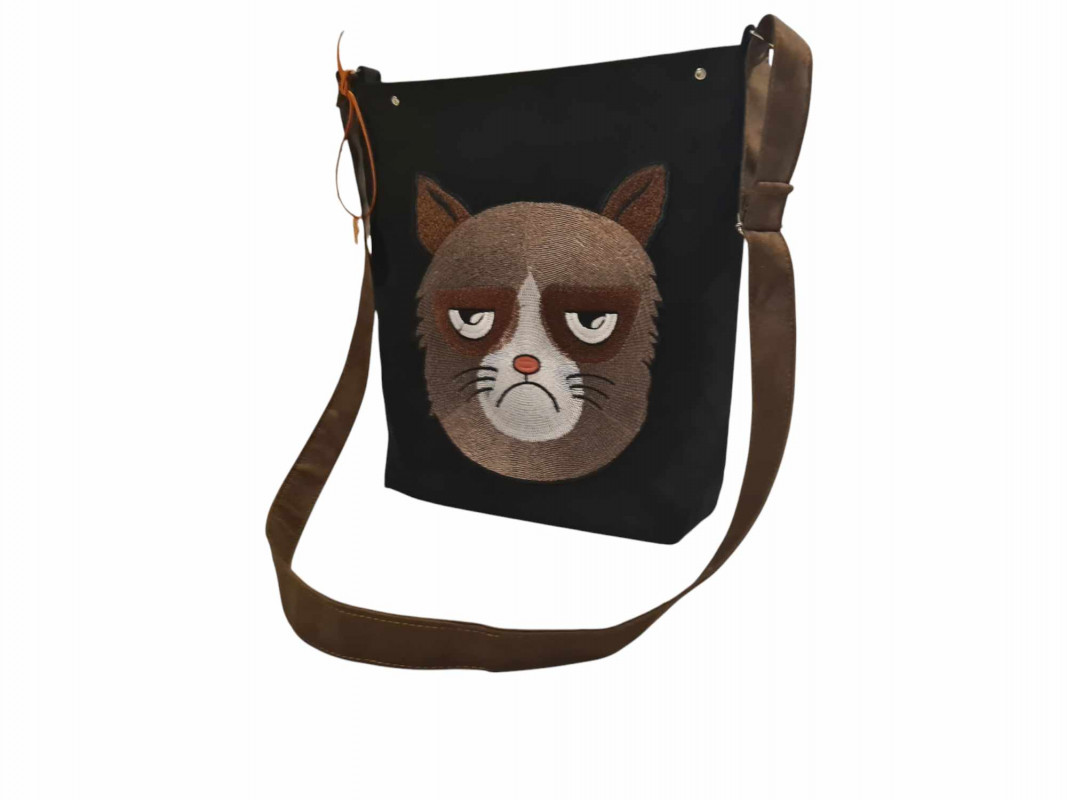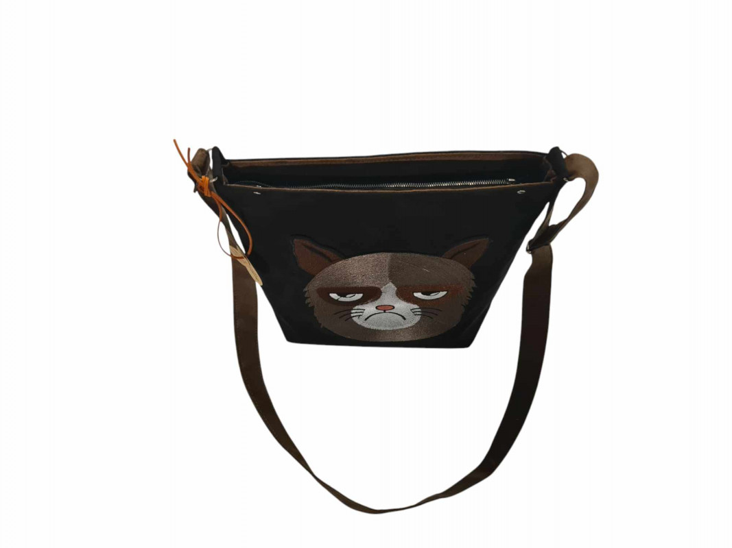 Torebka wykonana według autorskiego pomysłu z mocnej i gładkiej w dotyku tkaniny zamszowej o rewelacyjnych parametrach użytkowych! Ozdobna haftowana aplikacja z wizerunkiem rzędliwego kota jest bardzo dobrej jakości.Torebka zamykana jest na zamek, w środku dwie kieszonki dzielone. Listonoszka ładnie trzyma kształt, dno jest usztywnione. Pasek regulowany.