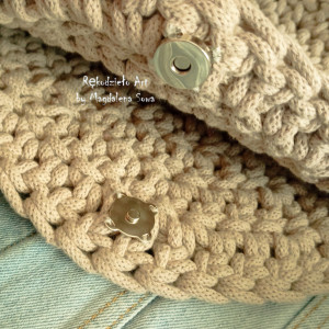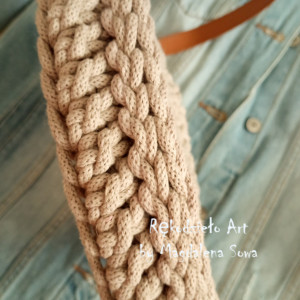 Torebka wykonana została na szydełku ze sznurka bawełnianego 5 mm w kolorze perłowym.Zapięcie magnetyczne wewnątrz, pasek regulowany ze skóry ekologicznej.