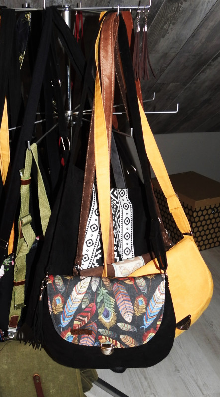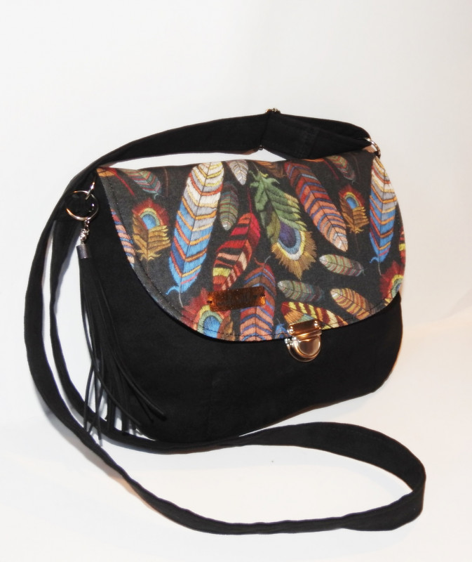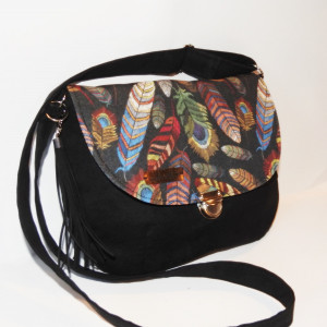 Torebka wykonana jest z zamszu tapicerskiego- tkaniny o rewelacyjnych parametrach użytkowych- odpornej na ścieranie, plamienie, trwałej i miłej w dotyku oraz grubej gabardyny w pióra.