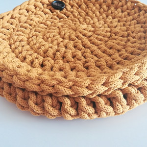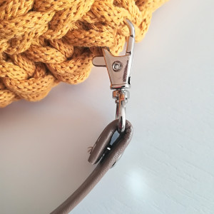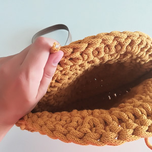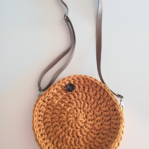Torebka wykonana jest na szydełku z bawełnianego sznurka 5mm. Pasek wykonany jest z eko skóry i zapinany na karabińczyki. Torebka zapinana na guzik. Średnica torebki to 28 cm