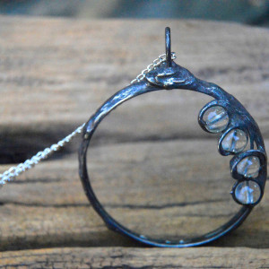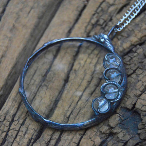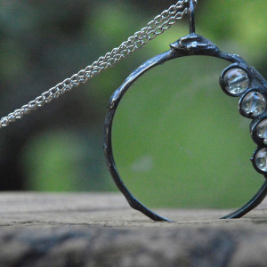Lupa z rączką średnicy 6 cm inkrustowana szklanymi bezbarwnymi kuleczkami oprawiona w miedź lutowaną stopem cyny i srebra. Całość patynowana na kolor starego srebra ręcznie przecierana i polerowana , zawieszona na 60 cm łańcuszku. Jeśli życzą sobie Państwo inną dowolną długość łańcuszka proszę o informacje mailową po zakupie a bez problemu to zmienię. Zapraszam do zakupu ...