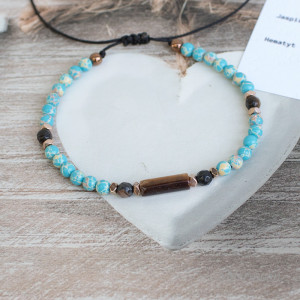 Turkusowa bransoletka dobrych życzeń. Damska bransoletka z minerałami – idealna na prezent. Pełna mocy i z ukrytym znaczeniem. Bransoletka wykonana ze starannie dobranych minerałów: jaspis imperial, fasetowane tygrysie oko, hematyty w dwóch kolorach, minerały o średnicy 2, 3 i 4 mm.
