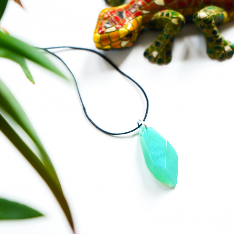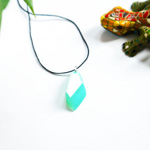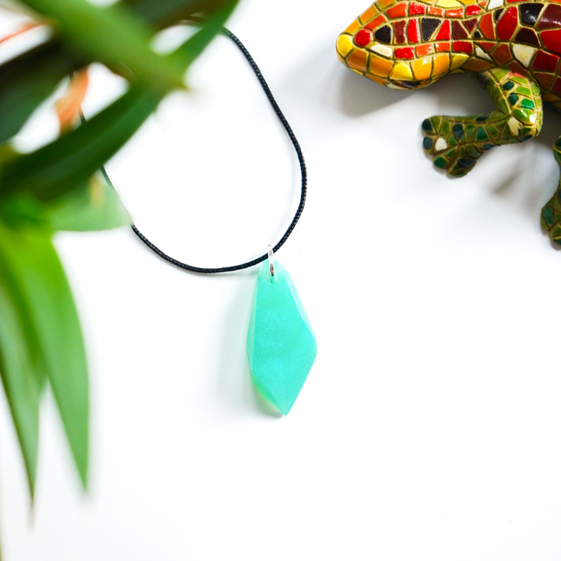 Turkusowy wisiorek w kształcie kryształu z żywicy epoksydowej, na czarnym sznurku z zapięciem.