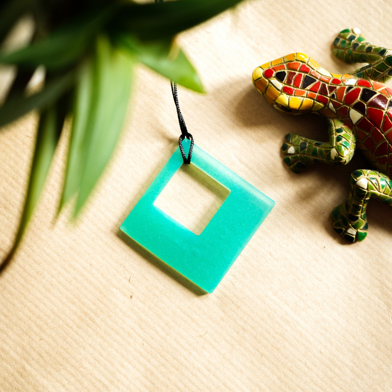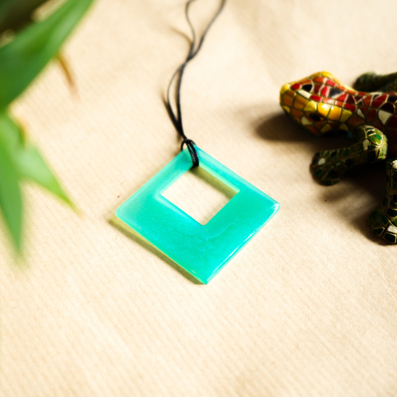 Turkusowy wisiorek romb z żywicy epoksydowej, na czarnym sznurku z zapięciem.