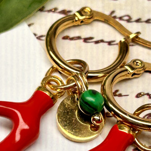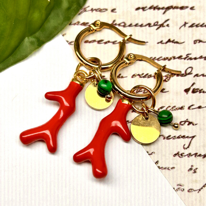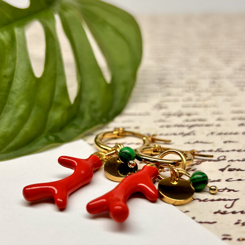 Te kolczyki o średnicy 13 mm łączą elegancję i moc dzięki zawieszkom w kształcie koralowca w intensywnej czerwonej barwie. Wykonane z emaliowanej stali nierdzewnej, zawieszki przyciągają wzrok, nadając całości wyjątkowego charakteru. Uzupełnione o malachit, kamień transformacji, kolczyki emanują pozytywną energią i subtelną elegancją, tworząc harmonijną kompozycję.
