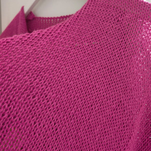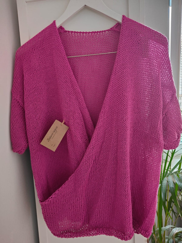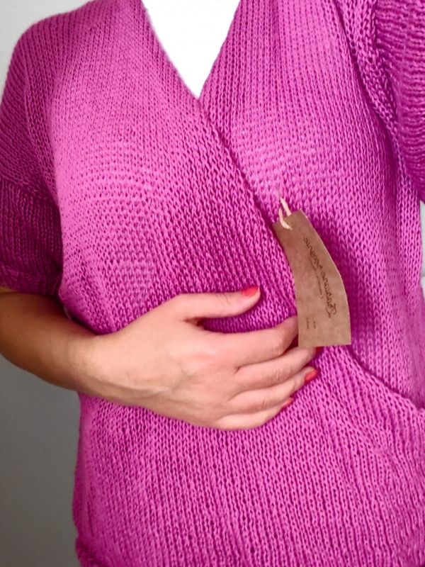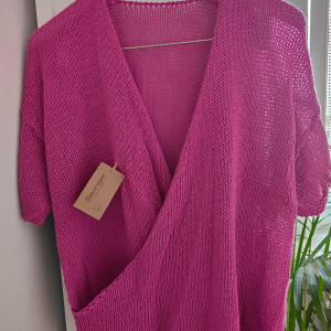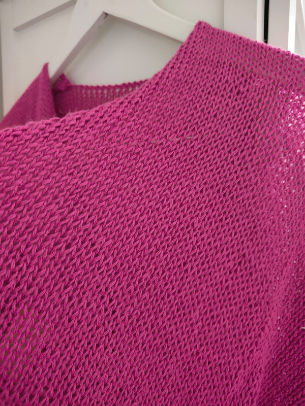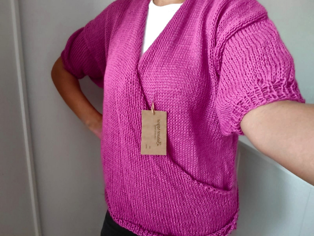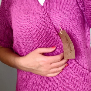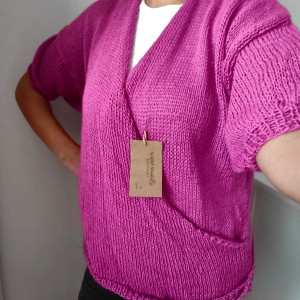 Uroczy sweterek w kolorze fuksji,wykonany ręcznie na drutach z bardzo dobrej jakości nici merynos. Cechuje go lekkość, jest bardzo miły w dotyku i nie drapie