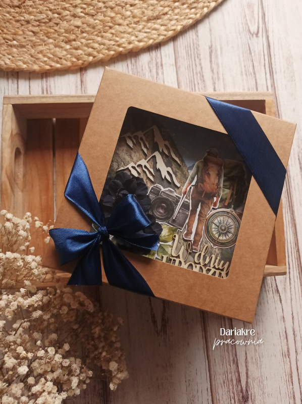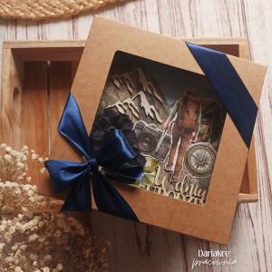 Kartka zapakowana jest w pudełko o wysokości 2,5 cm, 15x15 cm. Pudełko przewiązane wstążką w kolorystyce pasującej do wnętrza kartki. Praca wykonana metodą scrapbookingu, każda z nich jest inna i unikatowa. Jeżeli szukasz wyjątkowej pamiątki dla bliskiej osoby, dobrze trafiłeś/aś, kartka sprawdzi się świetnie jako prezent lub dodatek do prezentu, a zapakowana w pudełeczko będzie efektownym upominkiem.