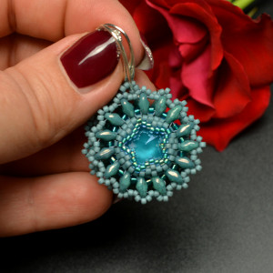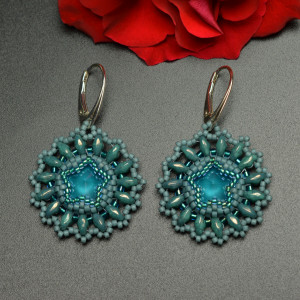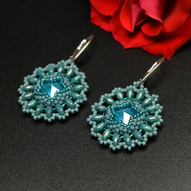 Ich serce stanowią kryształy rivoli Swarovskiego w kolorze crystal azure blue, które oplotłam najwyższej jakości japońskimi koralikami Toho i Miyuki oraz czeskimi SuperDuo w odcieniach brudnego turkusu.