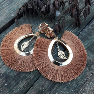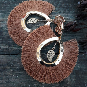 ,,w brązach,, to niezwykle kobiece kolczyki wykonane z dużych chwostów na obręczach w kolorze miedzianego brązu i metalowych elementów w kolorze ciepłego złota. Kolczyki zawieszone są na ozdobnych biglach typu sztyft.