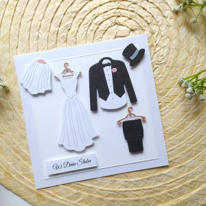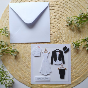 Wykonana ręcznie kartka na Ślub .W komplecie koperta i ochronna folia. Wymiary 13,5 na 13,5 cm. Istnieje możliwość dodania spersonalizowanego napisu.