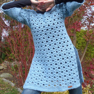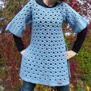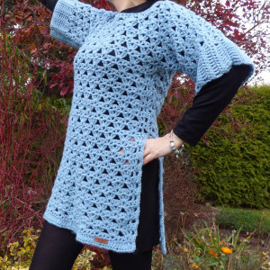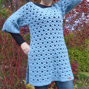 Niezwykle efektowna tunika w kolorze niebieskim wykonana szydełkiem ściegiem ażurowym z dobrej jakościowo mieszanki wełny i akrylu premium.