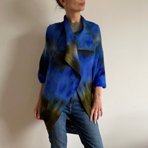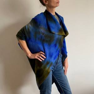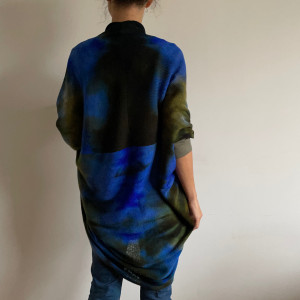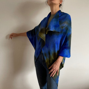 Ręcznie barwiony sweter z wysokiej jakości wełny z merynosów. Ten uniwersalny, luźny kardigan o ciekawym kształcie kokonu, można zarzucić w ciągu dnia do dżinsów, jak i na wieczorne wyjście do eleganckiej sukni. Tu góra może być dołem, a dół górą. Uzyskujemy wtedy dwa różne efekty. Dobrze komponuje się z szalem w tych odcieniach.