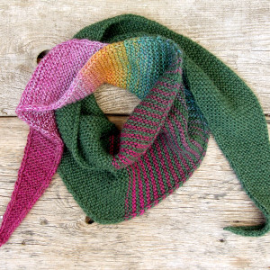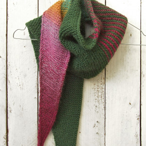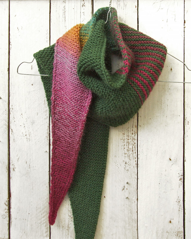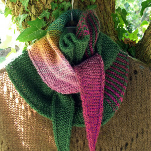 Kolory: połączyłam ciemną butelkową zieleń z motkiem włóczki ombre, który mieni się kolorami od ciemnej zieleni, przez turkus, oliwkę, pomarańcz, miód, lawendę i wrzos aż do ciemnej maliny. Jeden bok szalika jest cały zielony, a drugi cały kolorowy - daje to bardzo ciekawe i efektowne połączenie.