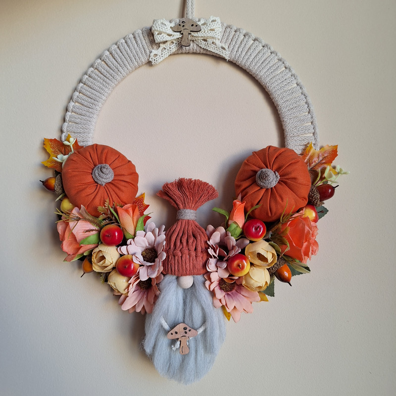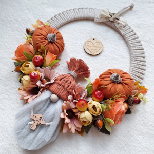 Wykonany na bazie drewniano-makramowej o średnicy 26 cm w kolorze beżowym, do tego zrobiony ręcznie jesienny skrzat i materiałowe dyńki, całość dopełniają kwiaty i liście.