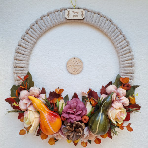 Wianek ma drewniano-makramową bazę o średnicy 31.5 cm w kolorze beżowym oraz ogrom typowo jesiennych dodatków, a także drewniany dekor z napisem Pięknej jesieni.