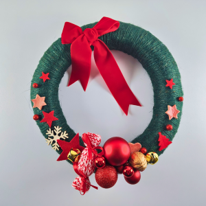 Wianek zdobią: akrylowe bombki, złote dzwonki janczary, pomalowany na złoto orzech włoski, ozdoby filcowe i brokatowe ze styropianu, ceramiczne gwiazdki, cukierek wykonany na drutach oraz czerwona aksamitka.