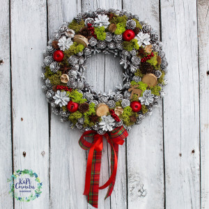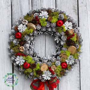 Wianek bożonarodzeniowy wykonany na podkładzie słomianym z szyszek i ozdób świątecznych. Średnica wianka wynosi 28cm. Wszystkie elementy są trwale przymocowane do podkładu za pomocą kleju na gorąco. Może stanowić świąteczną ozdobę drzwi, ściany, świątecznego stołu lub kominka. Świetny pomysł na świąteczny prezent dla bliskiej osoby. Jest to trwała ozdoba, która będzie cieszyła przez wiele lat.