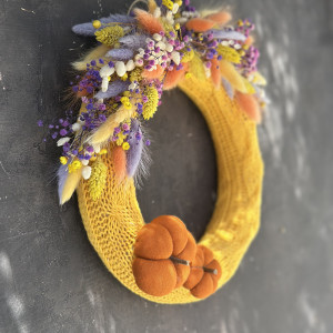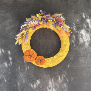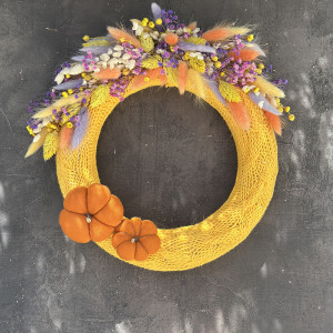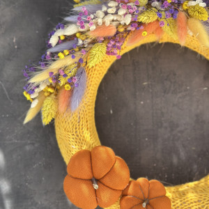 Ciekawa tekstura i oryginalny słonecznikowy kolor sprawiają, że wianek się wyróżnia i jest niepowtarzalny.