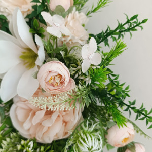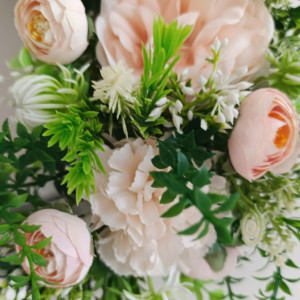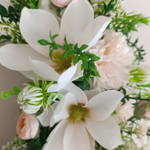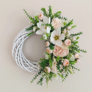 Zapraszam do zakupu białego wianka wiklinowego. Stroik na drzwi lub ścianę udekorowany kompozycją z kwiatów sztucznych m.in. trawami, piwoniami, magnoliami, dodatkami. Wianek może być wywieszony na zewnątrz, ale dla długiego okresu użytkowania zalecam, aby był osłonięty od skrajnych warunków atmosferycznych. Średnica obręczy 30 cm + ok. 9/11 cm wystających gałązek Dekoracja idealna do przystrojenia domu, biur, recepcji. Dodatkowo stroik ten może być wspaniałym pomysłem na prezent na rozmaite okazje: Dzień Matki, urodziny, imieniny, podziękowanie, jubileusz, wprowadziny. Stroik ten jest udekorowany i wykonany według mojego pomysłu. Kolory w rzeczywistości mogą nieznacznie różnić się od tych na zdjęciach, może wpływać na to m.in.ustawienie ekranu. Zapraszam na moje pozostałe ogłoszenia, gdzie znajdą Państwo mnóstwo innych modeli.