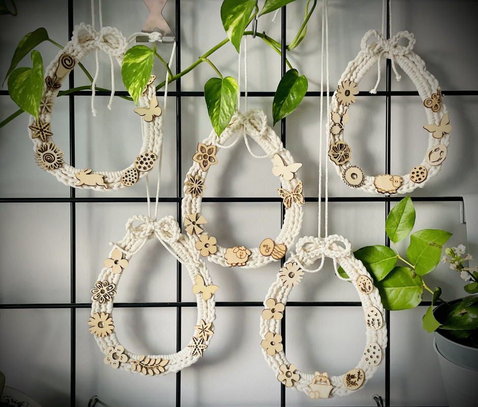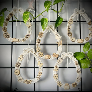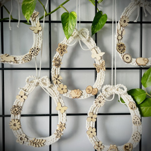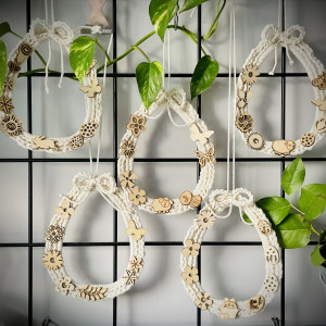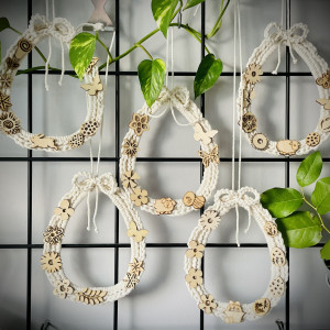 Dekoracja wykonana ze sznurka bawełnianego w kolorze ecru oraz tematycznych ozdobników drewnianych.