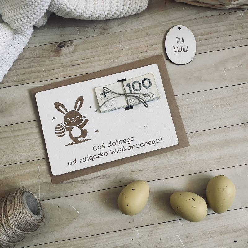 Zapakowany w kraftową kopertę z dołączonym imiennym jajeczkiem.