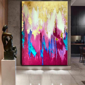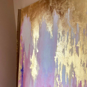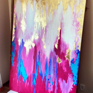 Oryginalny, ręcznie malowany obraz akrylowy z dodatkiem złota płatkowego. Obraz wyróżnia ciekawa struktura, żywe, energetyzujące kolory kontrastujące z elegancją złota. Obraz będzie wspaniałą ozdobą nowoczesnego i eleganckiego domu. Abstrakcyjny obraz w kolorach złota, różu, fioletu, turkusu i bieli. Na obrazie nie ma koloru czerwonego. Obraz jest w kolorze różowym, magenta.