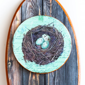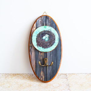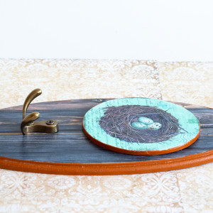 mdf, papier do decoupagu, farba akrylowa, lakier akrylowy, metalowy haczyk, zawieszka